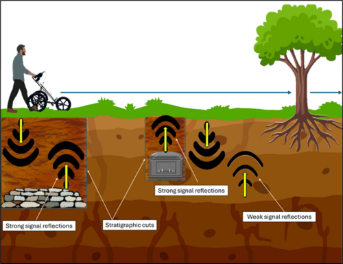 GPR is a non-invasive technique that utilizes radio waves emitted from an antenna and relayed to a computer to map features buried beneath the ground surface. The image below displays an idealized schematic of objects and features buried beneath the ground surface that are reflective when imaged via GPR. The second image displays the same schematic, but with actual radargrams or the output from GPR, where the features appear as vertical breaks within the normal layers of earth, or stratigraphy, beneath the surface.