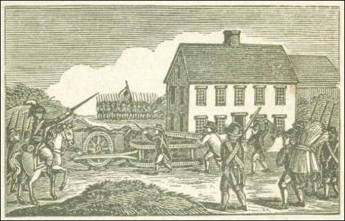 Woodcut of the Third Engagement and Barricade at the Battle of Ridgefield.