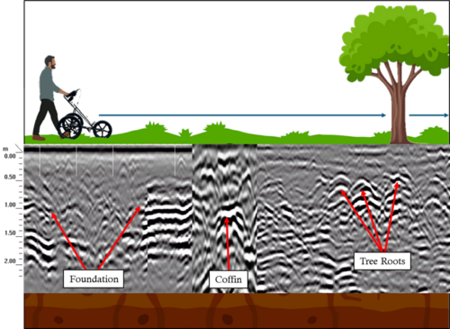Schematic of GPR data collection, with actual radargrams of buried features, as indicated by labels.
