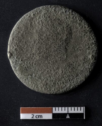 Example of normal photography (left) and RTI image (right) a faint silhouette is visible in the image to the image to the right, which Heritage has identified as a George II half penny, in general use between 1729 – 1754, but still in circulation during the American Revolution.