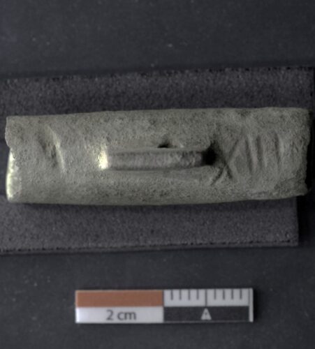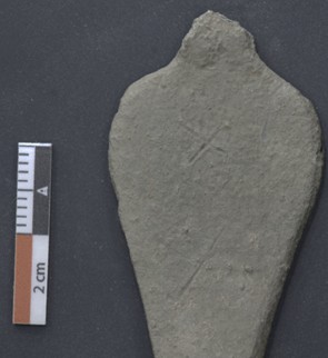 Left: RTI image of dog nose cast pewter spoon, with incised “X” and “/”, possibly indicative of an individual’s mark on the spoon; Right: RTI image of copper ramrod pipe engraved with “XIII”, from a British land pattern musket.