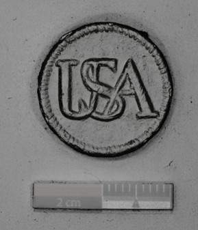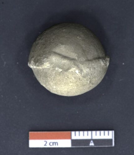 Left: Specularly enhanced RTI image of an enlisted Continental Army USA button; Right: RTI image of a 0.68” diameter British musket ball (Brown Bess 0.75 caliber musket), poorly cast, with visible seams and casting sprue.