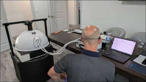 Kurt conducting RTI beneath the white dome, with a fixed position for the digital single lens reflex camera, and with various lighting of the artifact beneath the dome throughout the image capture process.