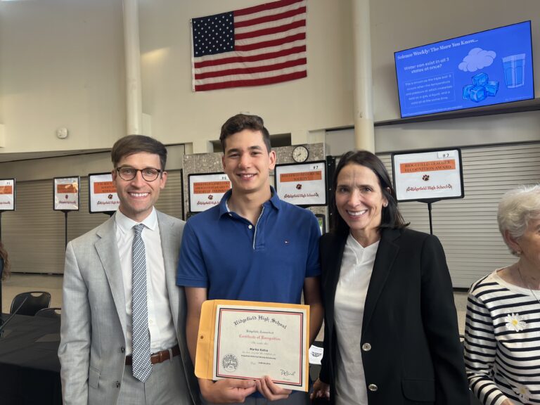 Marko Katra was presented the Ridgefield Historical Society’s annual scholarship by Stephen Bartkus, Executive Director and Tracy Seem, Board President.